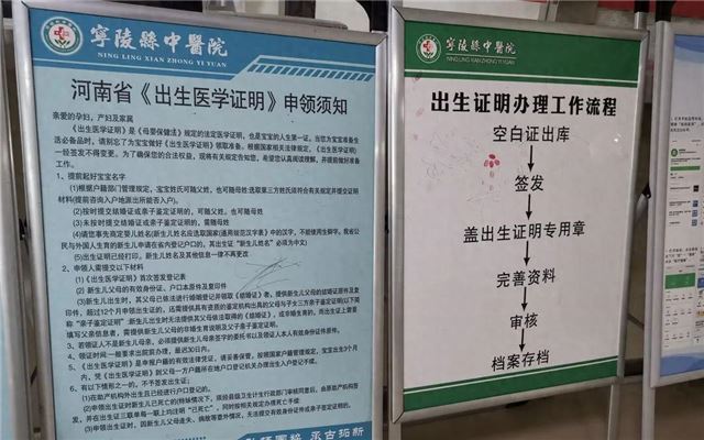▲宁陵县中医院出生证办理窗口外的公示栏写明,出生医学证明是法定医学证明,是申报户籍的法律凭证。新京报记者 程亚龙 摄