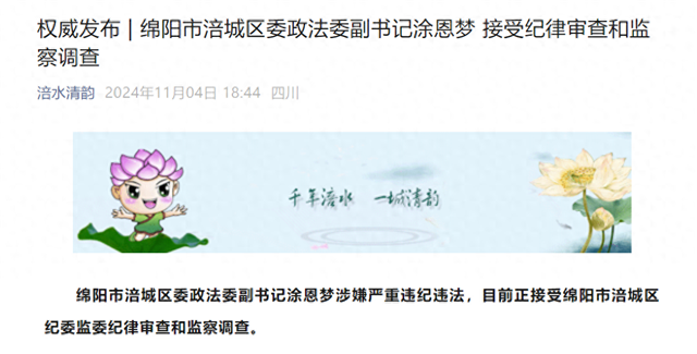 据涪水清韵消息:绵阳市涪城区委政法委副书记涂恩梦涉嫌严重违纪违法,目前正接受绵阳市涪城区纪委监委纪律审查和监察调查。