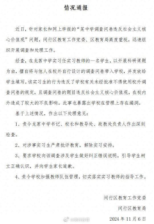 新京报讯 11月6日,上海市闵行区教育局官方微博发布情况通报。
