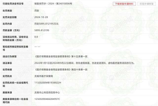 处罚决定日期为2024年10月28日的锡医保罚字【2024】第24010006号行政处罚决定书显示,无锡虹桥医院有限公司违法事实为:“2022年1月1日至2024年9月22日期间,存在虚假就医、伪造变造资料、虚构医药服务项目的行为。”该公司被处以罚款58958121.95元。