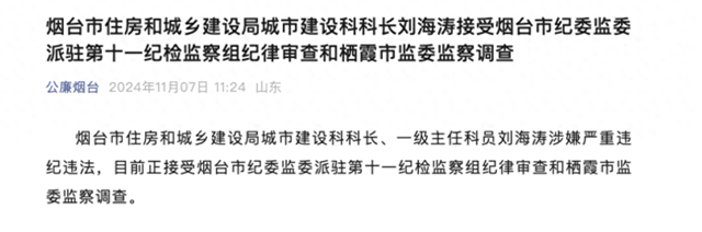 11月7日,据公廉烟台消息:烟台市住房和城乡建设局城市建设科科长、一级主任科员刘海涛涉嫌严重违纪违法,目前正接受烟台市纪委监委派驻第十一纪检监察组纪律审查和栖霞市监委监察调查。