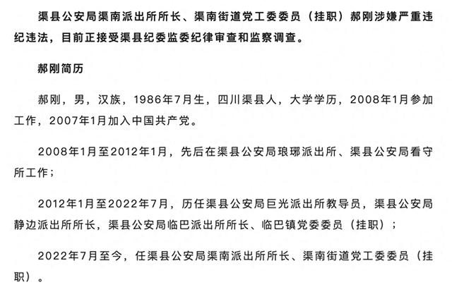 渠县公安局渠南派出所所长、渠南街道党工委委员(挂职)郝刚涉嫌严重违纪违法,目前正接受渠县纪委监委纪律审查和监察调查。