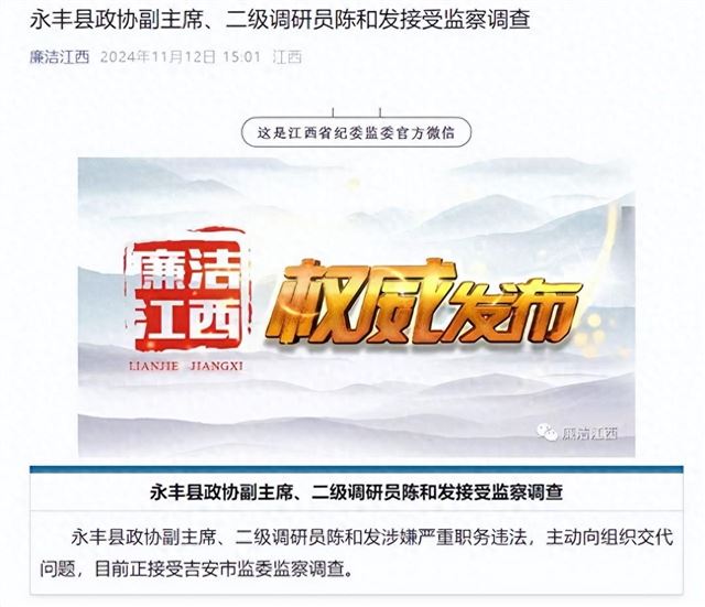 11月12日,据廉洁江西消息:江西永丰县政协副主席、二级调研员陈和发涉嫌严重职务违法,主动向组织交代问题,目前正接受吉安市监委监察调查。