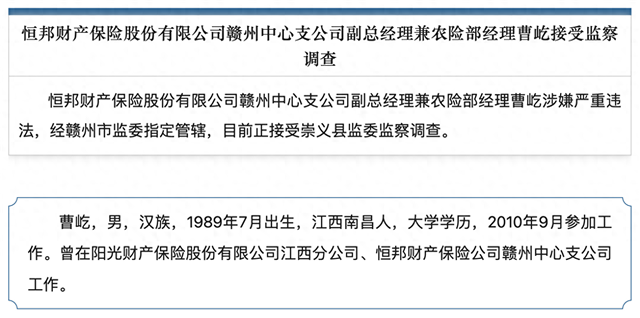 恒邦财产保险股份有限公司赣州中心支公司副总经理兼农险部经理曹屹涉嫌严重违法,经赣州市监委指定管辖,目前正接受崇义县监委监察调查。