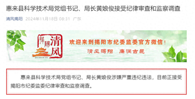 惠来县科学技术局党组书记、局长黄娘俊涉嫌严重违纪违法,目前正接受揭阳市纪委监委纪律审查和监察调查。