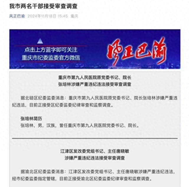 据北碚区纪委监委消息:重庆市第九人民医院原党委书记、院长张培林涉嫌严重违纪违法,目前正接受区纪委监委纪律审查和监察调查。