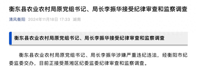 11月18日,据清风衡阳消息:衡东县农业农村局原党组书记、局长李振华涉嫌严重违纪违法,经衡阳市纪委监委交办,目前正接受蒸湘区纪委监委纪律审查和监察调查。