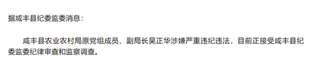 咸丰县农业农村局原党组成员、副局长吴正华涉嫌严重违纪违法,目前正接受咸丰县纪委监委纪律审查和监察调查。