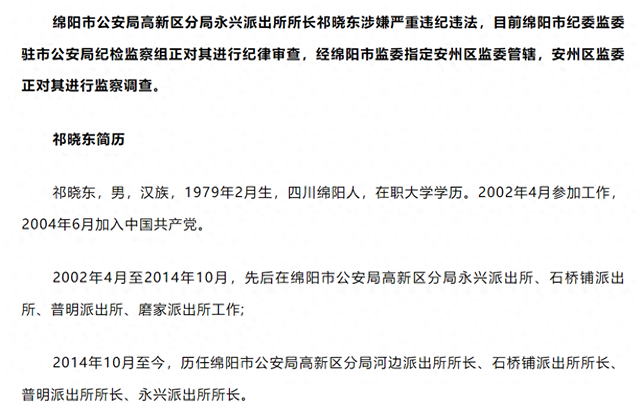 绵阳市公安局高新区分局永兴派出所所长祁晓东涉嫌严重违纪违法,目前绵阳市纪委监委驻市公安局纪检监察组正对其进行纪律审查,经绵阳市监委指定安州区监委管辖,安州区监委正对其进行监察调查。