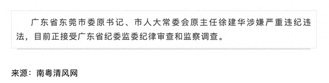 广东省东莞市委原书记、市人大常委会原主任徐建华涉嫌严重违纪违法,目前正接受广东省纪委监委纪律审查和监察调查。