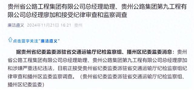 11月21日,据廉洁遵义:贵州省公路工程集团有限公司总经理助理、贵州公路集团第九工程有限公司总经理廖加和涉嫌严重违纪违法,目前正接受贵州省纪委监委派驻省交通运输厅纪检监察组纪律审查和播州区监委监察调查。