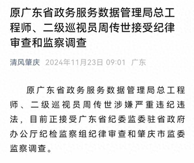 南都讯 记者蔡雯 23日,据清风肇庆消息,原广东省政务服务数据管理局总工程师、二级巡视员周传世涉嫌严重违纪违法,目前正接受广东省纪委监委驻省政府办公厅纪检监察组纪律审查和肇庆市监委监察调查。
