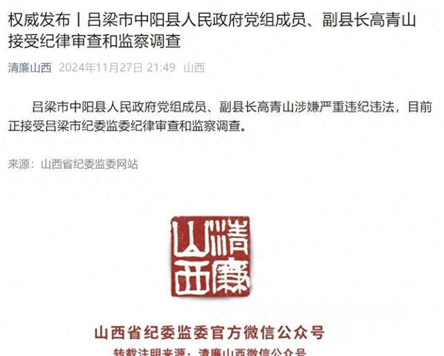 吕梁市中阳县人民政府党组成员、副县长高青山涉嫌严重违纪违法,目前正接受吕梁市纪委监委纪律审查和监察调查。