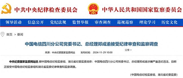 11月29日,中央纪委国家监委网站讯 据中国电信纪检监察组、湖北省纪委监委消息:中国电信四川分公司党委书记、总经理郑成渝涉嫌严重违纪违法,目前正接受中国电信纪检监察组和湖北省监委纪律审查和监察调查。