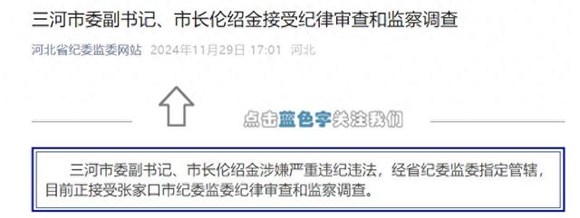 11月29日,据河北省纪委监委网站消息:三河市委副书记、市长伦绍金涉嫌严重违纪违法,经省纪委监委指定管辖,目前正接受张家口市纪委监委纪律审查和监察调查。