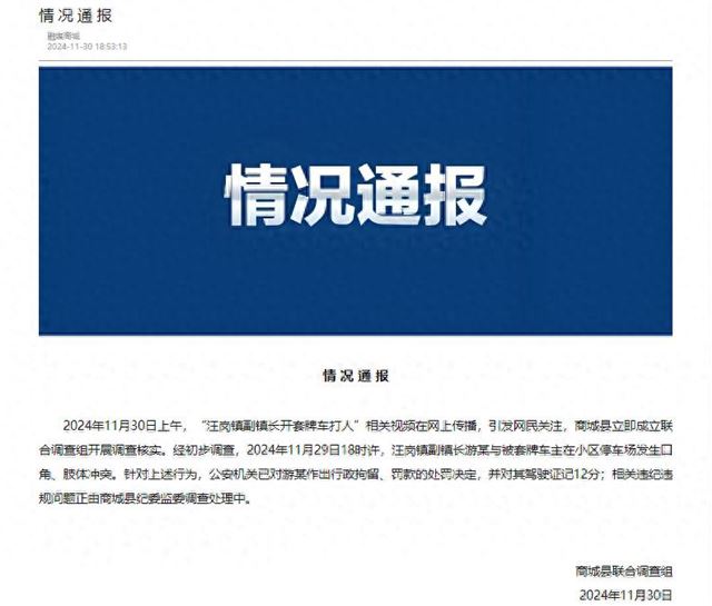 情 况 通 报 2024年11月30日上午,“汪岗镇副镇长开套牌车打人”相关视频在网上传播,引发网民关注,商城县立即成立联合调查组开展调查核实。经初步调查,2024年11月29日18时许,汪岗镇副镇长游某与被套牌车主在小区停车场发生口角、肢体冲突。针对上述行为,公安机关已对游某作出行政拘留、罚款的处罚决定,并对其驾驶证记12分;相关违纪违规问题正由商城县纪委监委调查处理中。 商城县联合调查组 2024年11月30日