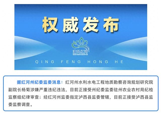 红河州水利水电工程地质勘察咨询规划研究院副院长杨菊涉嫌严重违纪违法,目前正接受州纪委监委驻州农业农村局纪检监察组纪律审查;经红河州监委指定泸西县监委管辖,目前正接受泸西县监委监察调查。