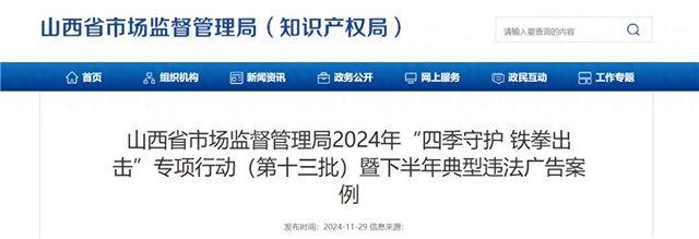 2024年下半年,山西省市场监管系统深入开展民生领域广告监管专项行动,坚持以人民为中心的发展思想,加大监管执法力度,不断营造清朗有序的广告市场环境。为发挥典型案例警示教育作用,引导广大经营主体合法合规经营,现将部分典型违法广告案例予以公布。
