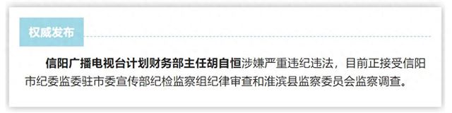 信阳广播电视台计划财务部主任胡自恒涉嫌严重违纪违法,目前正接受信阳市纪委监委驻市委宣传部纪检监察组纪律审查和淮滨县监察委员会监察调查。