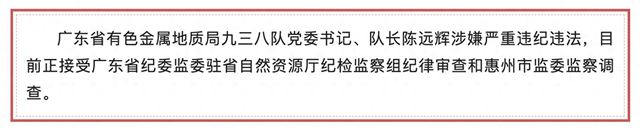 广东省有色金属地质局九三八队党委书记、队长陈远辉涉嫌严重违纪违法,目前正接受广东省纪委监委驻省自然资源厅纪检监察组纪律审查和惠州市监委监察调查。