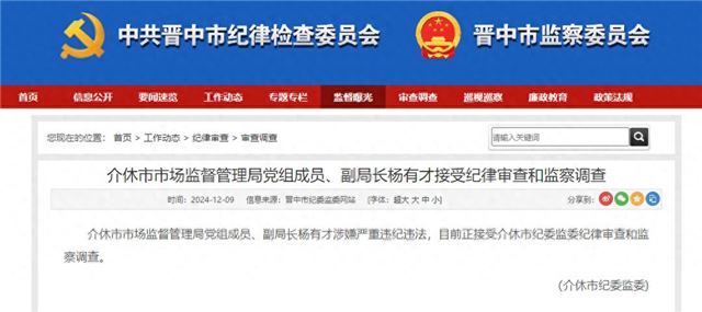 12月9日,据晋中市纪委监委网站消息,介休市市场监督管理局党组成员、副局长杨有才涉嫌严重违纪违法,目前正接受介休市纪委监委纪律审查和监察调查。(介休市纪委监委)