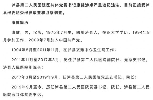 泸县第二人民医院医共体党委书记康健涉嫌严重违纪违法,目前正接受泸县纪委监委纪律审查和监察调查。