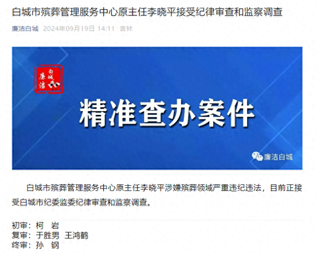 白城市殡葬管理服务中心原主任李晓平涉嫌殡葬领域严重违纪违法,目前正接受白城市纪委监委纪律审查和监察调查。