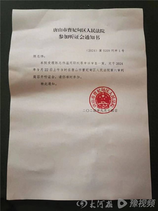 陈志伟滥用职权罪申诉审查一案,将于9月22日上午在唐山市曹妃甸区人民法院召开听证会。