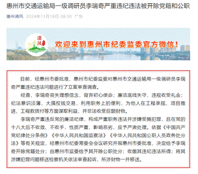 目前,经惠州市委批准,惠州市纪委监委对惠州市交通运输局一级调研员李瑞奇严重违纪违法问题进行了立案审查调查。