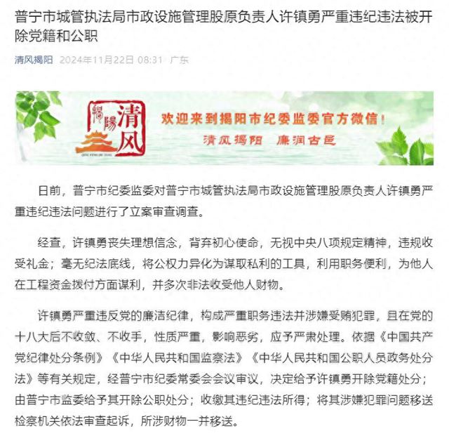 普宁市城管执法局市政设施管理股原负责人许镇勇严重违纪违法被“双开”