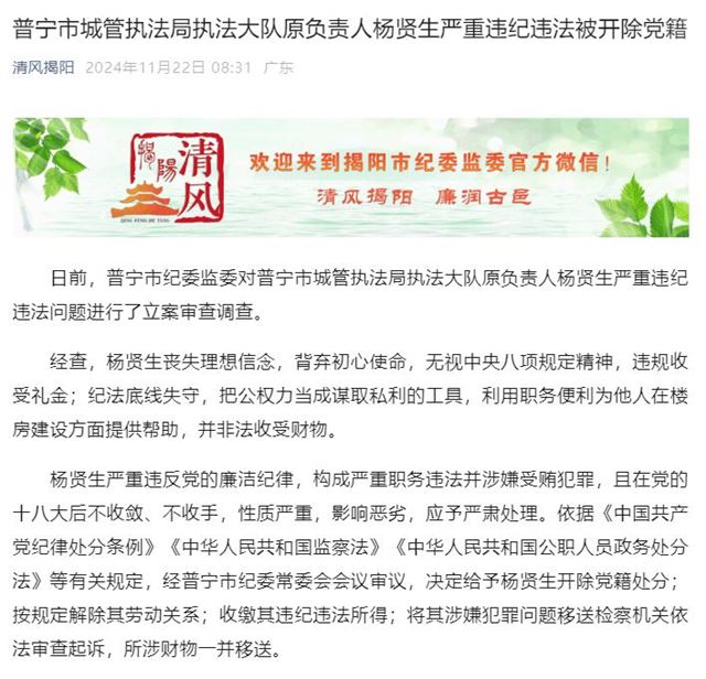 普宁市城管执法局执法大队原负责人杨贤生严重违纪违法被开除党籍