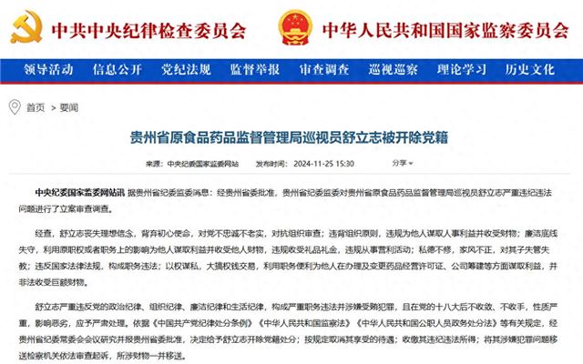 11月25日,据中央纪委国家监委网站消息:经贵州省委批准,贵州省纪委监委对贵州省原食品药品监督管理局巡视员舒立志严重违纪违法问题进行了立案审查调查。