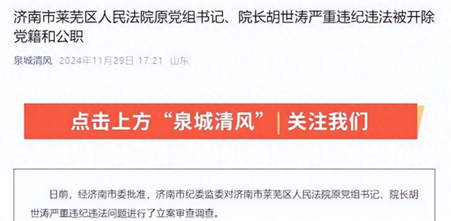 11月29日,据泉城清风:日前,经济南市委批准,济南市纪委监委对济南市莱芜区人民法院原党组书记、院长胡世涛严重违纪违法问题进行了立案审查调查。