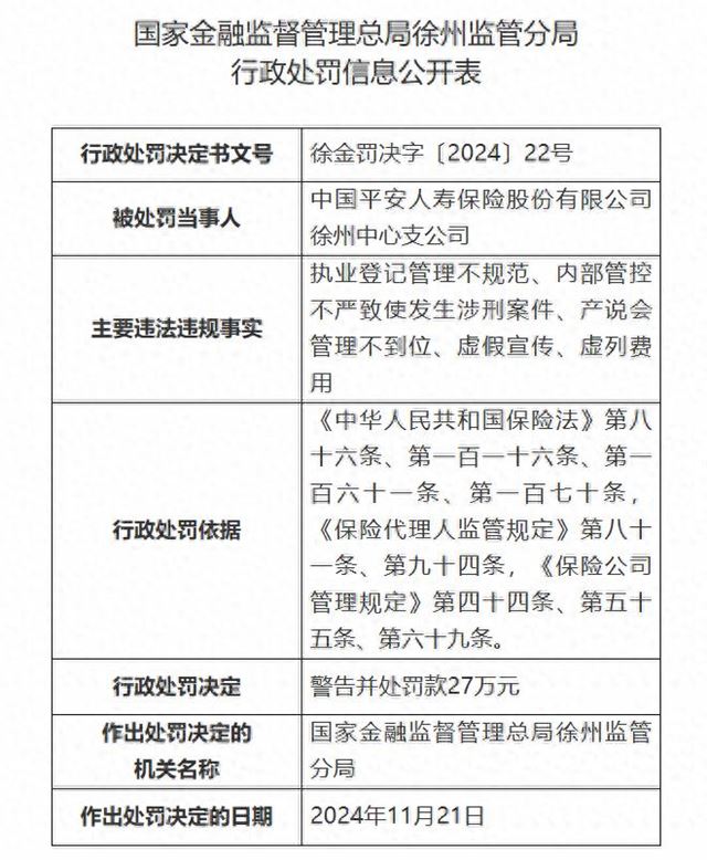 据国家金融监督管理总局徐州监管分局近日披露的行政处罚信息,中国平安人寿保险股份有限公司徐州中心支公司,因执业登记管理不规范、内部管控不严致使发生涉刑案件、产说会管理不到位、虚假宣传、虚列费用,被罚款27万元。