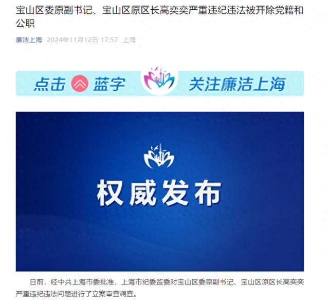 日前,经中共上海市委批准,上海市纪委监委对宝山区委原副书记、宝山区原区长高奕奕严重违纪违法问题进行了立案审查调查。