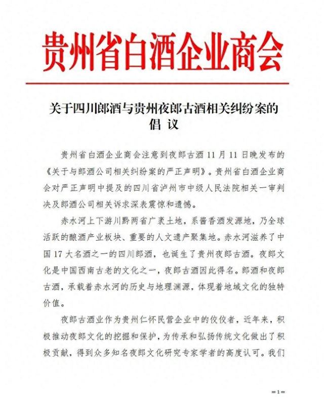 11月13日,贵州省仁怀市酒业协会指出,茅台、习酒、郎酒、夜郎古酒等赤水河孕育出来的白酒品牌各有地域文化价值,夜郎古酒业近年积极推动夜郎文化的挖掘和保护,为传承和弘扬传统文化作出积极贡献。2020年,川黔产区代表白酒企业曾共同签署世界酱香型白酒核心产区企业共同发展宣言,贵州省仁怀市酒业协会倡议,涉诉双方摒除成见,以理性务实的态度沟通交流,妥善处理知识产权及所谓“不正当竞争”等方面的分歧。