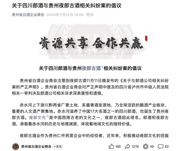 11月12日,贵州省白酒企业商会指出,夜郎文化是中国西南古老的文化之一,夜郎古酒因此得名。赤水河是酱香酒发源地,滋养了四川郎酒,也诞生了贵州夜郎古酒,两个品牌承载着赤水河的历史与地理渊源和地域文化价值。