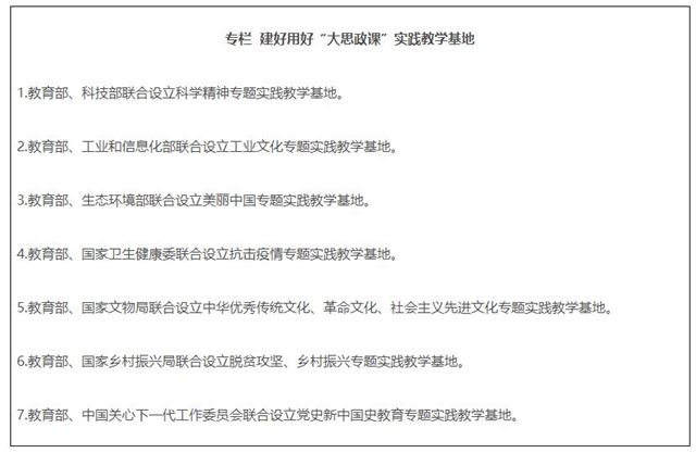 10.建好用好实践教学基地。教育部会同有关部门,利用现有基地(场馆),分专题设立一批“大思政课”实践教学基地。发挥好教育部高校思政课教师研学基地的实践教学功能。各地教育部门要结合实际,积极建设“大思政课”实践教学基地。大中小学要主动对接各级各类实践教学基地,开发现场教学专题,开展实践教学。有条件的学校可与有关基地建立长效合作机制,加强研究和资源开发。各基地要积极创造条件,与各地教育部门、学校建立有效工作机制,协同完成好实践教学任务。