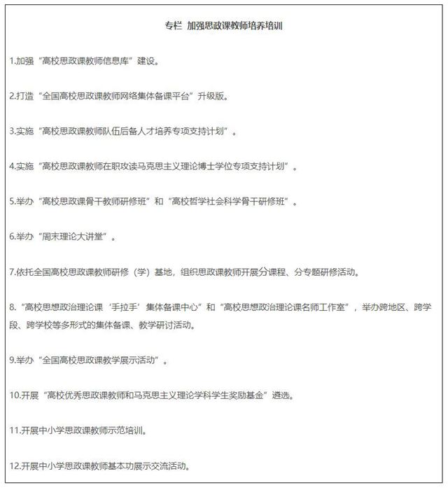 19.全面推进课程思政高质量建设。教育部组建高等学校课程思政教学指导委员会,研制普通本科专业类课程思政教学指南,组织开展高校教师课程思政教学能力培训,建设一批课程思政系列共享资源库。建成一批课程思政示范高校,推出一批课程思政示范课程,选树一批课程思政教学名师和团队,建设一批高校课程思政教学研究示范中心。加强中小学学科德育建设。