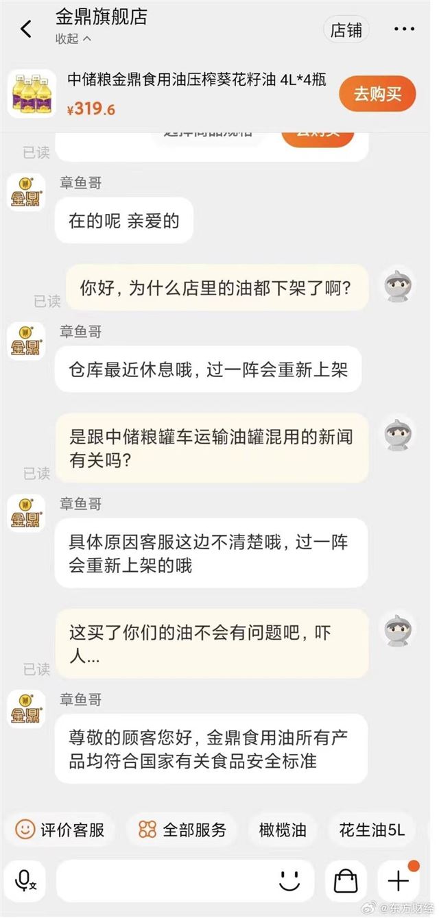 东方财经消息,7月8日下午,有网友发现中储粮旗下食用油品牌金鼎淘宝旗舰店系列食用油已下架。有媒体报道,客服回应称,仓库最近休息,过一阵会重新上架。当问及金鼎下架食用油是否与近期中储粮罐车运输油罐混用事件有关,客服称具体原因不清楚。