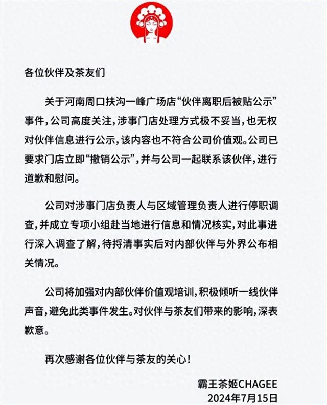 15日晚间,霸王茶姬道歉。霸王茶姬表示,关于河南周口扶沟一峰广场店“伙伴离职后被贴公示”事件,涉事门店处理方式极不妥当,也无权对伙伴信息进行公示,该内容也不符合公司价值观。公司已要求门店立即“撤销公示”。此外,霸王茶姬已对涉事门店负责人与区域管理负责人进行停职调查,并成立专项小组赴当地进行信息和情况核实。