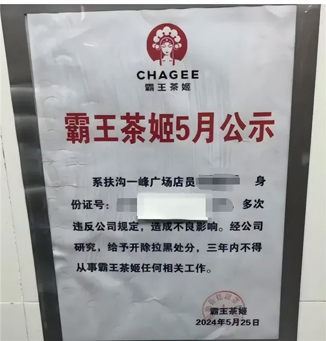 据媒体报道,7月14日河南周口,一名女子在社交平台发文称,自己从霸王茶姬离职后,被店方张贴身份证号公示。女子表示事后她联系了门店,门店称只贴了1个小时,为了贴给督导看。