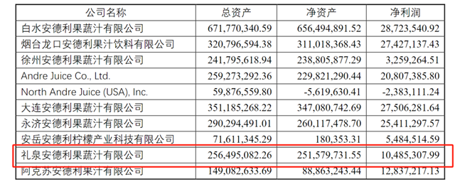 官网资料显示,安德利创建于1996年,是山东安德利集团的支柱企业,世界浓缩果汁主要生产与供应商之一,是农业产业化国家重点龙头企业、全国农产品加工业出口示范企业、中国食品工业出口百强企业,生产的浓缩苹果清汁被评为“中国名牌产品”。公司先后在山东、陕西、江苏、辽宁、山西、四川、新疆等省区建有10个浓缩果汁加工厂,拥有19条世界先进的浓缩果汁生产线,设计年加工果品能力100万吨,公司产品以浓缩果汁、果糖为主,还包括果浆、鲜榨果汁(NFC果汁)、香精等产品,产品的出口比例约占80%。2003年4月,公司在香港上市;2020年9月,在上海证券交易所A股上市,成为国内第一家饮料类,也是烟台市第一家“A+H”双上市企业。据悉,安德利的客户包括可口可乐、百事可乐、娃哈哈、统一等众多国内外知名品牌。