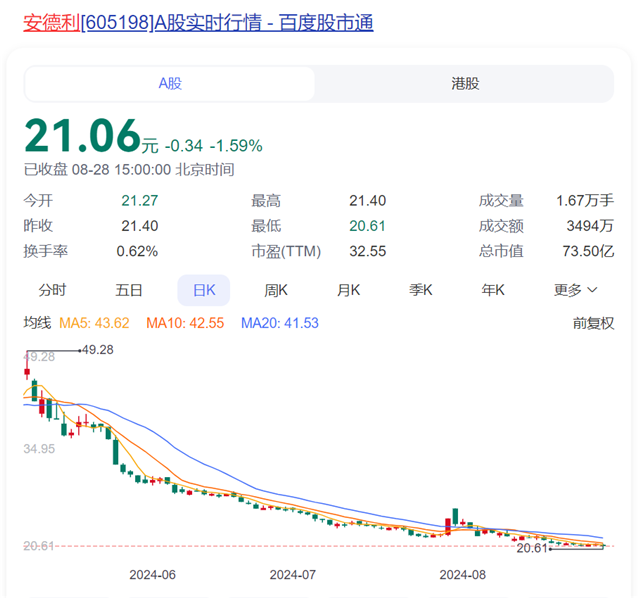 截至8月28日收盘,安德利股价报收21.06元,跌1.59%,较年中高点49.28元已跌了超过一半,总市值73.5亿元。