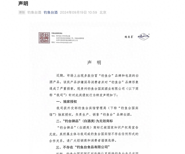 新京报讯(记者秦胜南)9月19日,贵州钓鱼台国宾酒业有限公司(下称“钓鱼台酒”)在微信公众号发布声明称,近期市场上出现多款仿冒“钓鱼台”品牌和包装的白酒产品,其中,“钓台御品”(白酒类)商标已被国家知识产权局宣告无效,“钓鱼台食品有限公司”已不存在等。