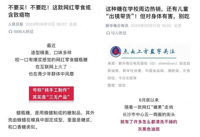 然而,人民日报等多家权威机构都通过官方渠道发布提醒:不要买、不要吃蜡瓶糖,因为很多属于“三无”产品,原料不可靠,部分产品经检测发现含有多环芳烃这一致癌风险物。
