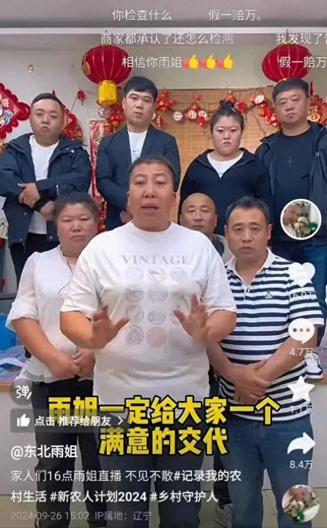 10月8日,#东北雨姐拍摄基地人去房空#冲上热搜。网红东北雨姐删除了其个人主页上的道歉视频,仅保留一份落款为“东北雨姐 2024年9月30日”的声明。国庆假期期间并未更新动态,也没有直播。9月26日,东北雨姐发视频回应殴打打假博主及红薯粉条事件,提到红薯粉条无红薯事件,称9月21日就将粉条送检了,如果有质量问题,一定会给大家一个满意的交代。