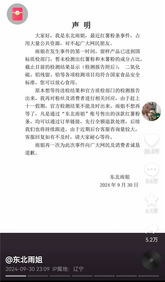 “东北雨姐”解释,原本想等待送检结果和官方质检部门的检测报告出来再回应粉丝及消费者,由于赶上十一假期,官方检测结果不能及时出来。凡是通过“东北雨姐”账号售出的该款红薯粉条,均可以通过订单链接,先行全额退款处理。