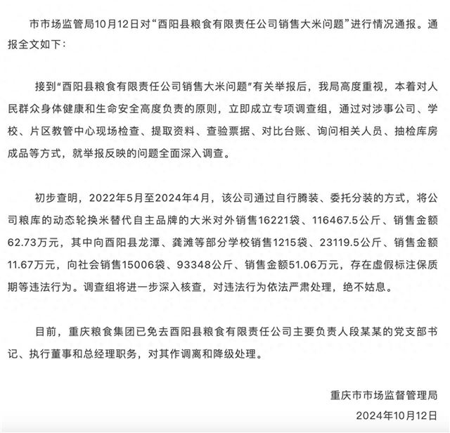 重庆市市场监管局10月12日对“酉阳县粮食有限责任公司销售大米问题”进行情况通报。通报全文如下: