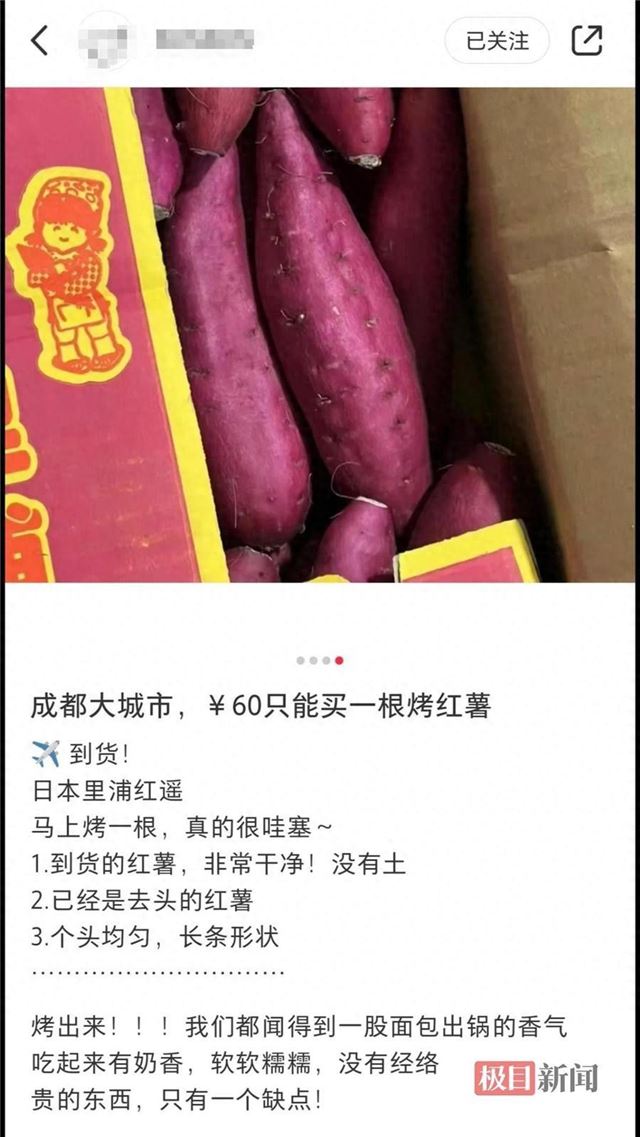 据四川观察报道,成都一小店的烤红薯售价60元一个,店家此前回应称,该价位的红薯是日本空运过来的。有网友质疑,从日本进口红薯是否合规?